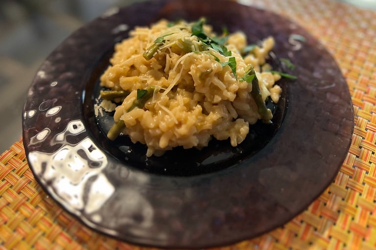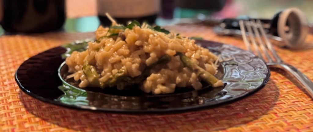 You can cook your asparagus in the risotto. I did that instead of cooking it separately. Next time, I'd cook the spears separately and add at the end. If you like a little bite to asparagus, I'd do it this way. You'll have more control over the doneness of the veggies.