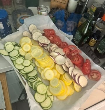 Using a mandolin (and a lot of care), slice your squash, eggplant, zucchini, and roma tomatoes and set aside.