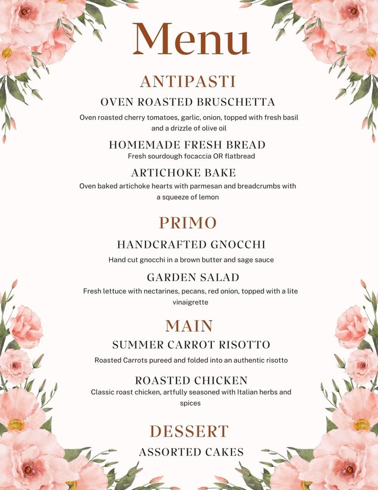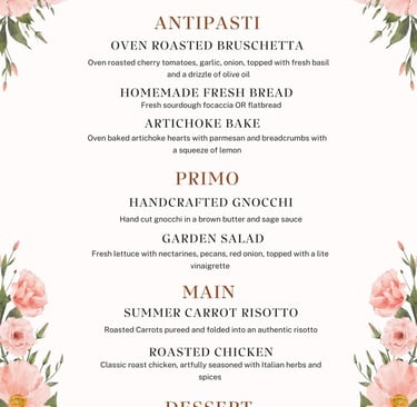 There were timelines and shopping lists and chatgpt prompts to scale up each recipe to feed 60 people. I spent the week prior making ricotta gnocchi by hand to feed as many. Sixty people include just the family! It's chaotic and awesome. Spending time down with her family is sort of like a magical time warp. Feeding that many people has to be organized. Normally, we're all about the buffet, but for this special occasion we had a several tables set up and the kitchen roped off for a sit down, family style event. This included kicking Grandma out of the kitchen several times. Each table had a "captain" that collected the dishes, brought them to the table, and explained each part of the meal. It was a giant team undertaking and an event that I look back on fondly.
